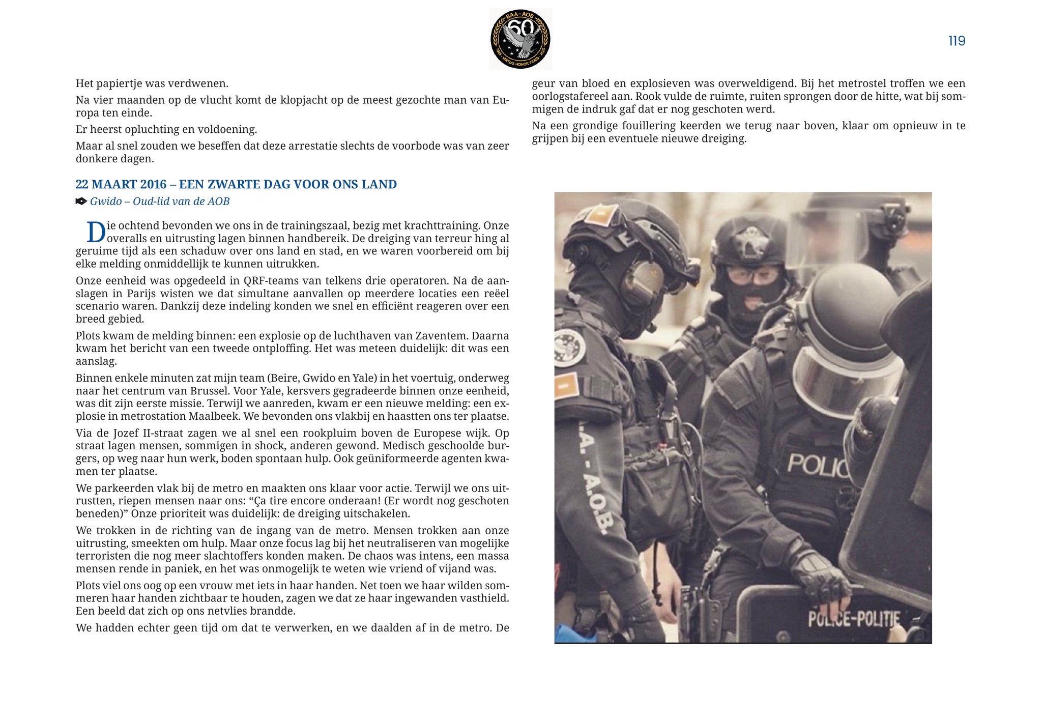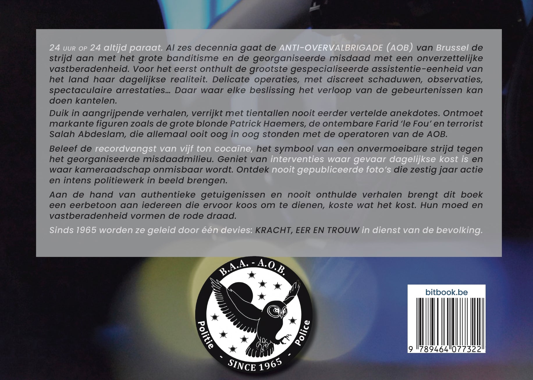 Duik in aangrijpende verhalen, verrijkt met tientallen nooit eerder vertelde anekdotes. Ontmoet markante figuren zoals de grote blonde Patrick Haemers, de ontembare Farid ‘le Fou’ en terrorist Salah Abdeslam, die allemaal ooit oog in oog stonden met de operatoren van de AOB.